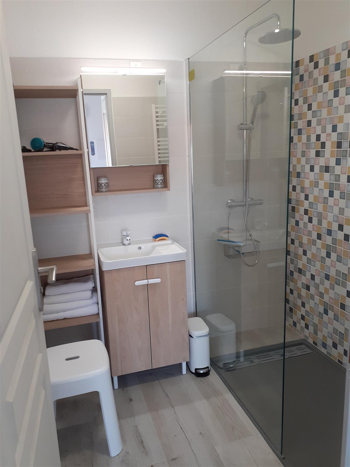 Fully-equipped shower room: vanity unit, storage unit, walk-in shower, hairdryer, heated towel rail, towels provided. Separate WC.