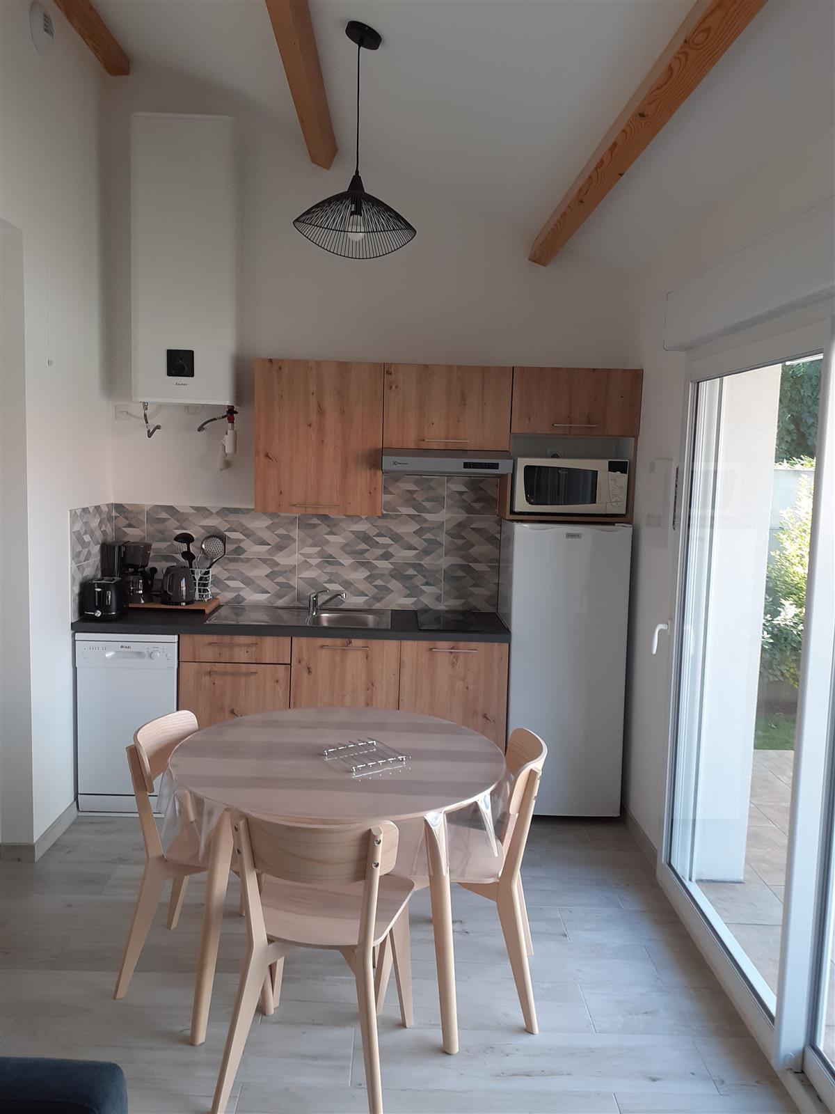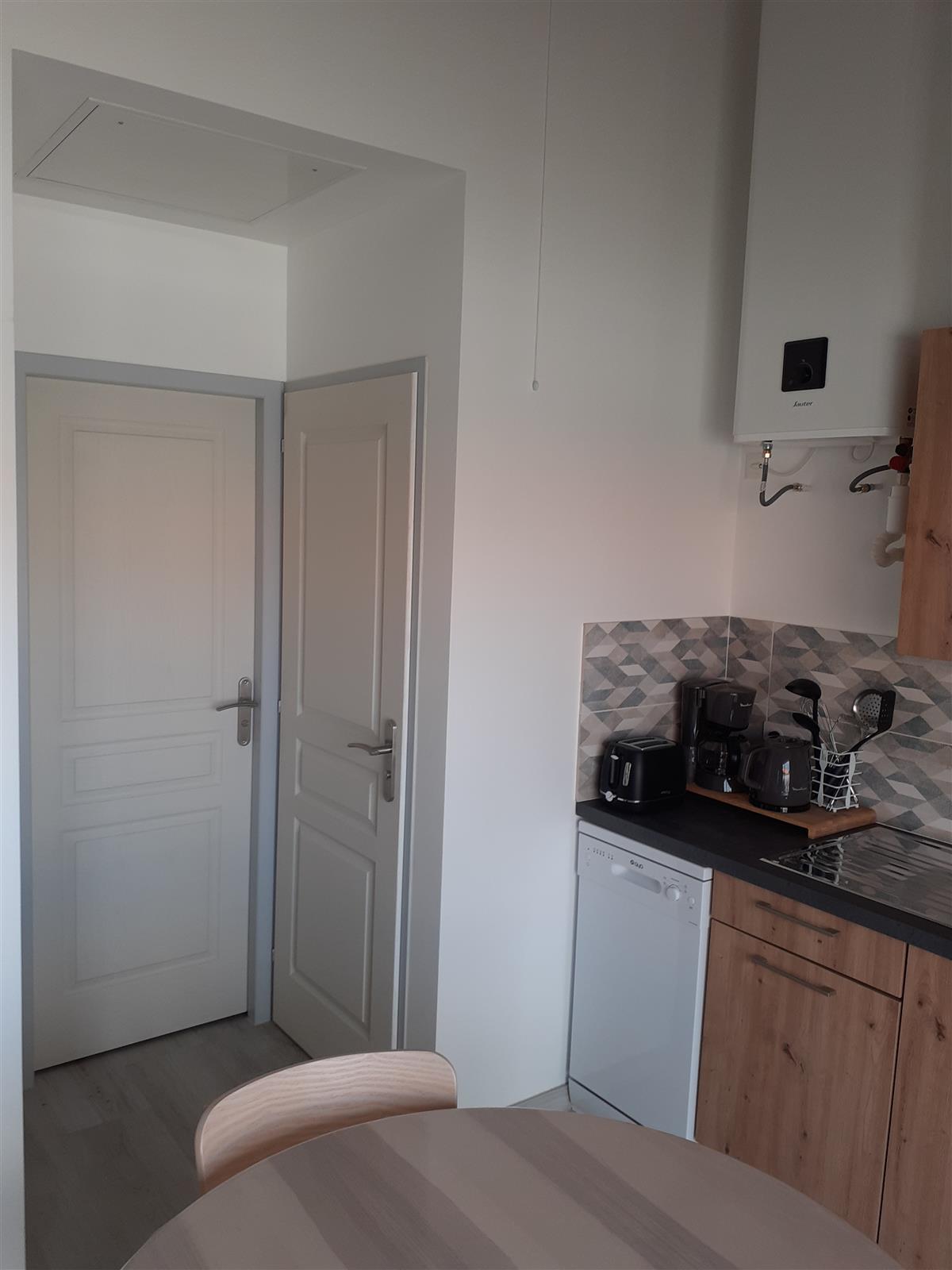 The entrance hall opens onto a living room/equipped kitchen (dishwasher, ceramic hob, fridge/freezer, microwave/grill, coffee maker, kettle, blender, tea towels, etc.).