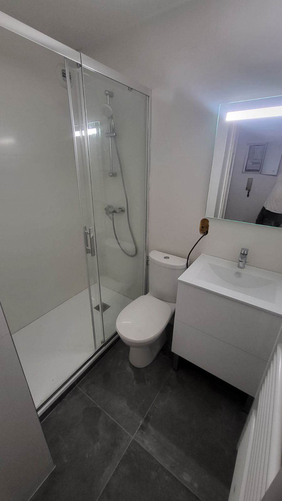 The bedroom has a double bed and a wardrobe. The bathroom includes a shower, a sink, and a toilet.