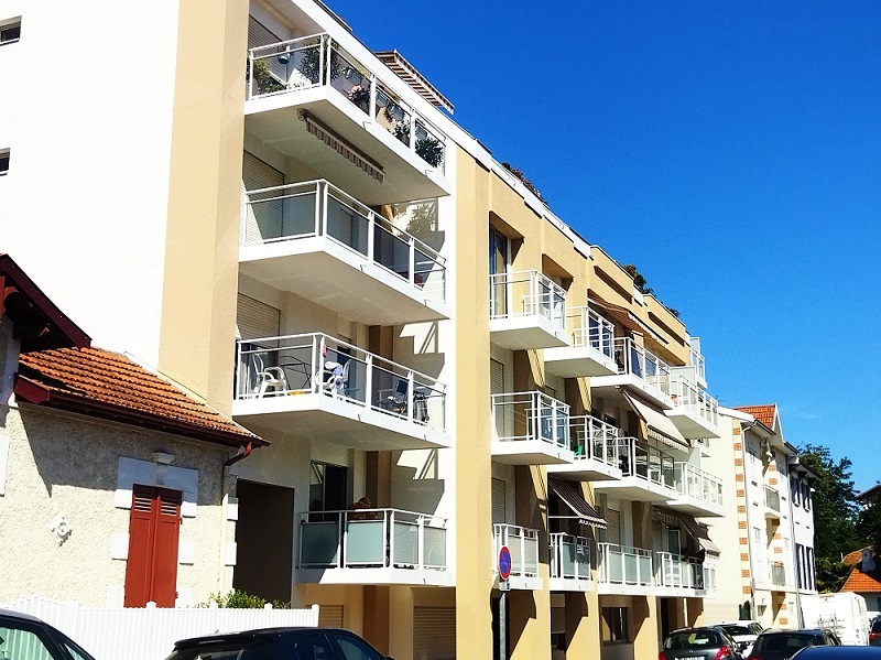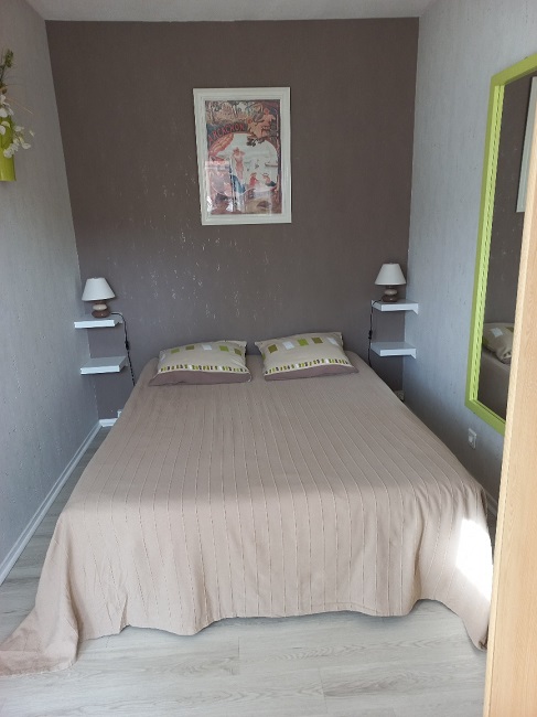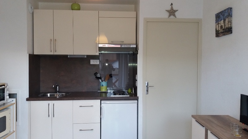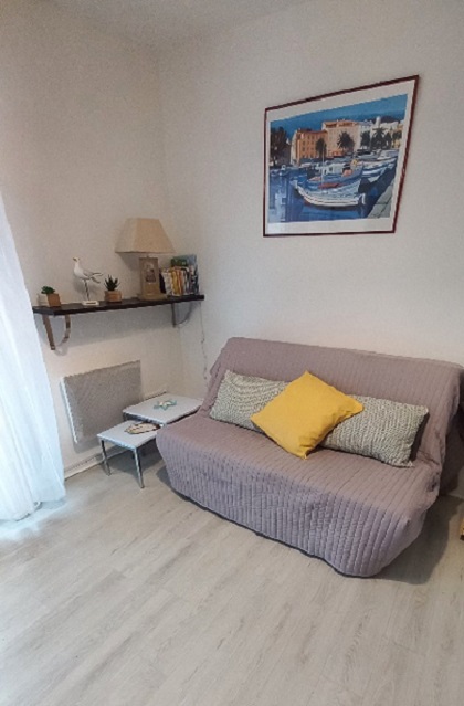 This one-bedroom apartment, located on the 2nd floor with elevator in the city center of Arcachon, includes a living room with equipped kitchenette, a dining area with table and chairs, as well as a BZ sofa and a television.