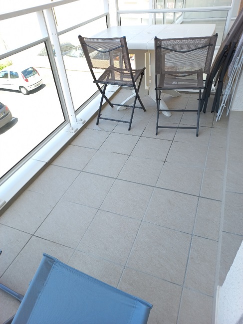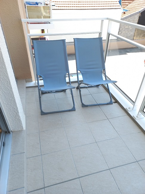 The balcony is furnished with a garden furniture set, two lounge chairs and an awning.