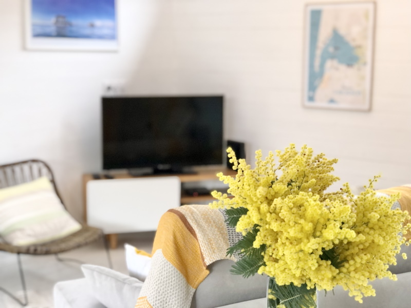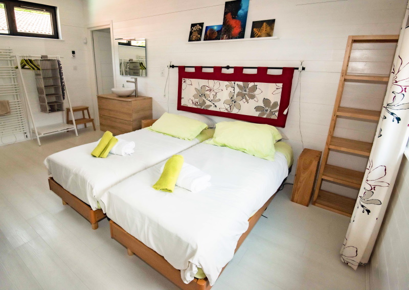 Open all year round, the villa is made up of 3 large, bright rooms. In the center, the living room with its open kitchen, its large bay window and its pellet stove. On each side of this central room, two beautiful bedrooms with comfortable bedding, integrated bathroom (walk-in showers, sink) and separate toilets for each.