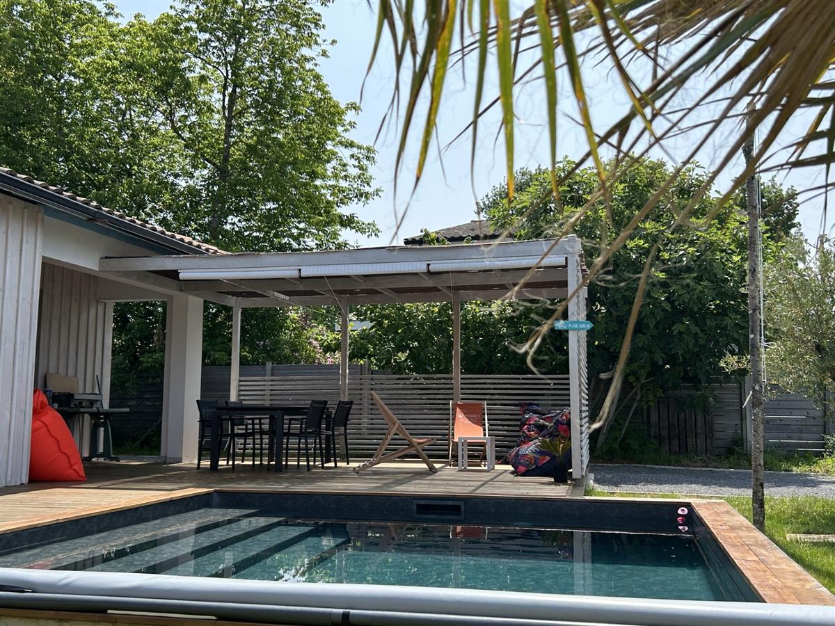 Piscina de agua salada, seguridad garantizada por una lona con barra.