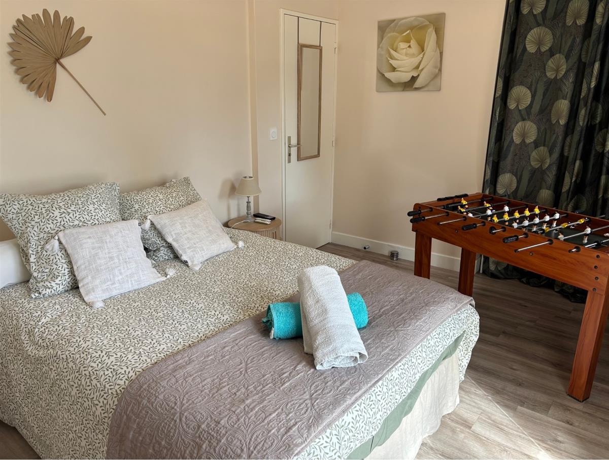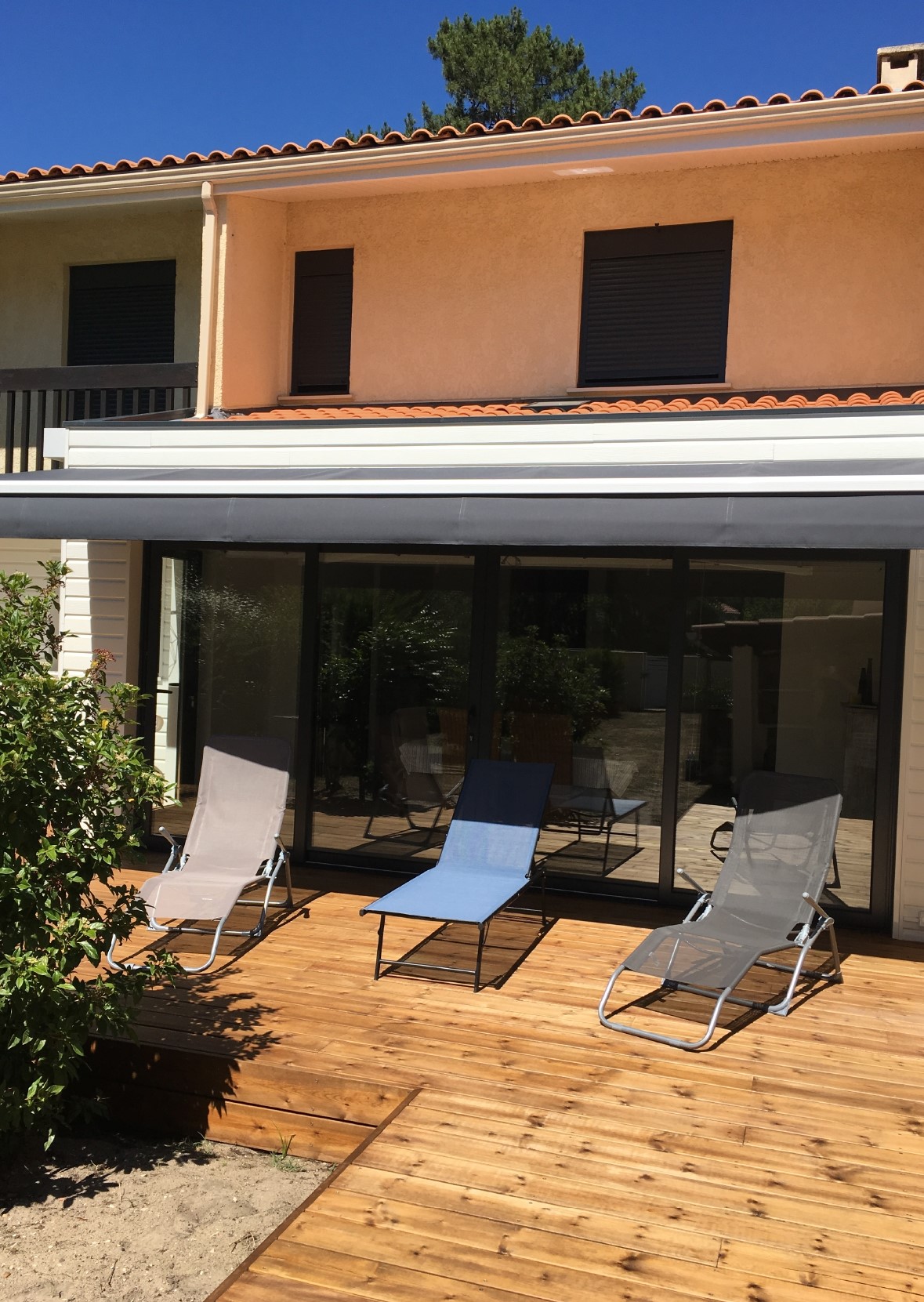 Casa familiar situada a 5 km de la Duna del Pilat, que consta de un dormitorio principal (1 x cama de 160 cm), armario y cuarto de ducha privado. wc separado. 2 dormitorios (camas de 140 cm) y armarios, 1 arriba cuarto de ducha con wc separado, amplio salón con sofá cama, TV, wifi. Aire acondicionado en el salón y los dos dormitorios de arriba, comedor con cocina americana totalmente equipada. .