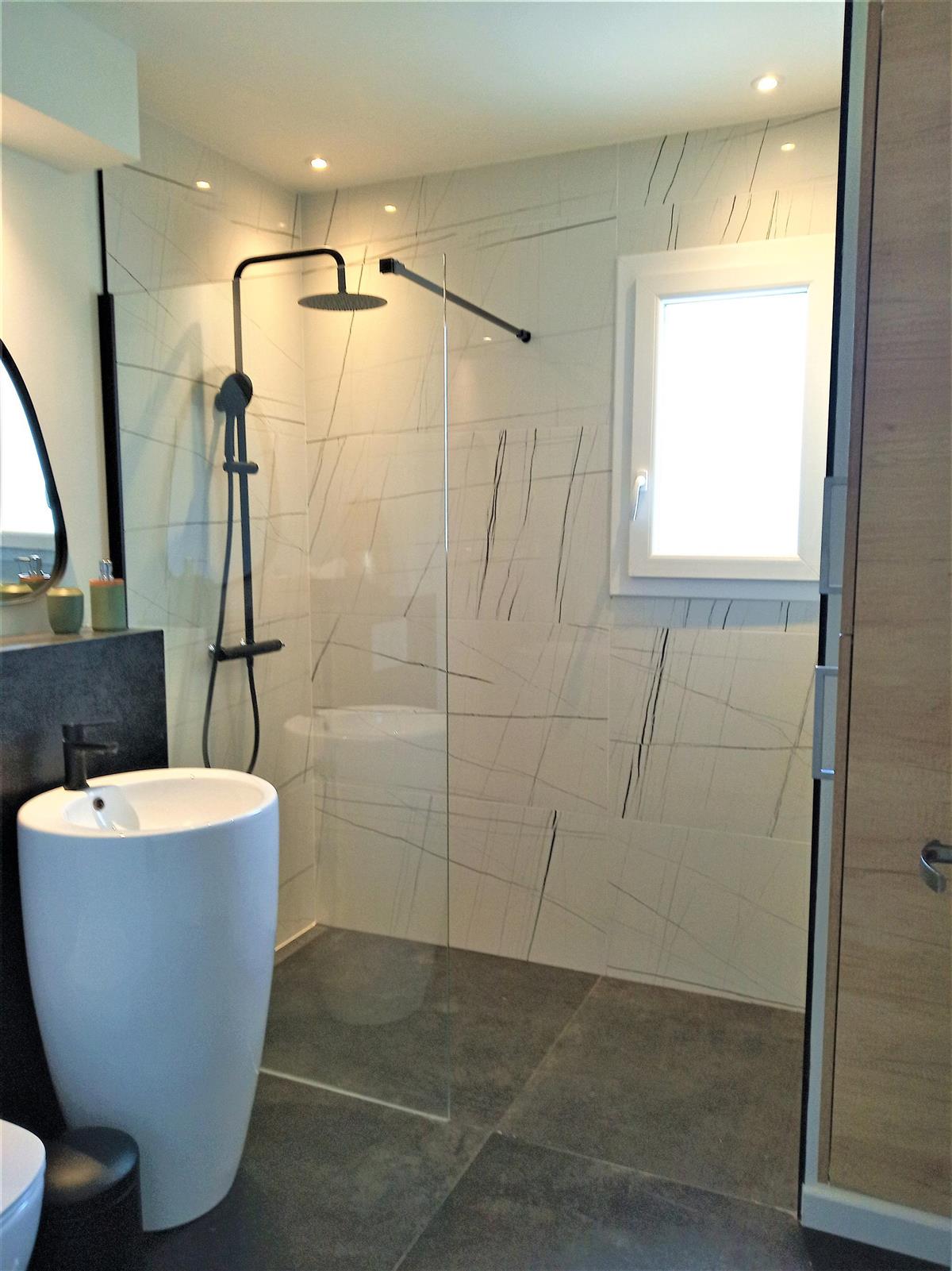 Salle d’eau séparée avec douche à l’italienne, lavabo et toilettes.