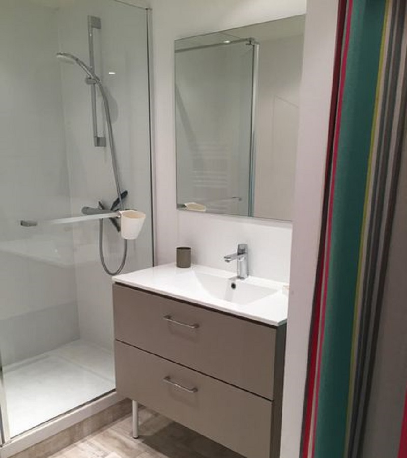 Un bagno di 6 m² con una grande doccia, un lavabo, uno scaldasalviette, uno spazio separato che ospita la lavatrice e uno spazio di stoccaggio e un WC separato.
