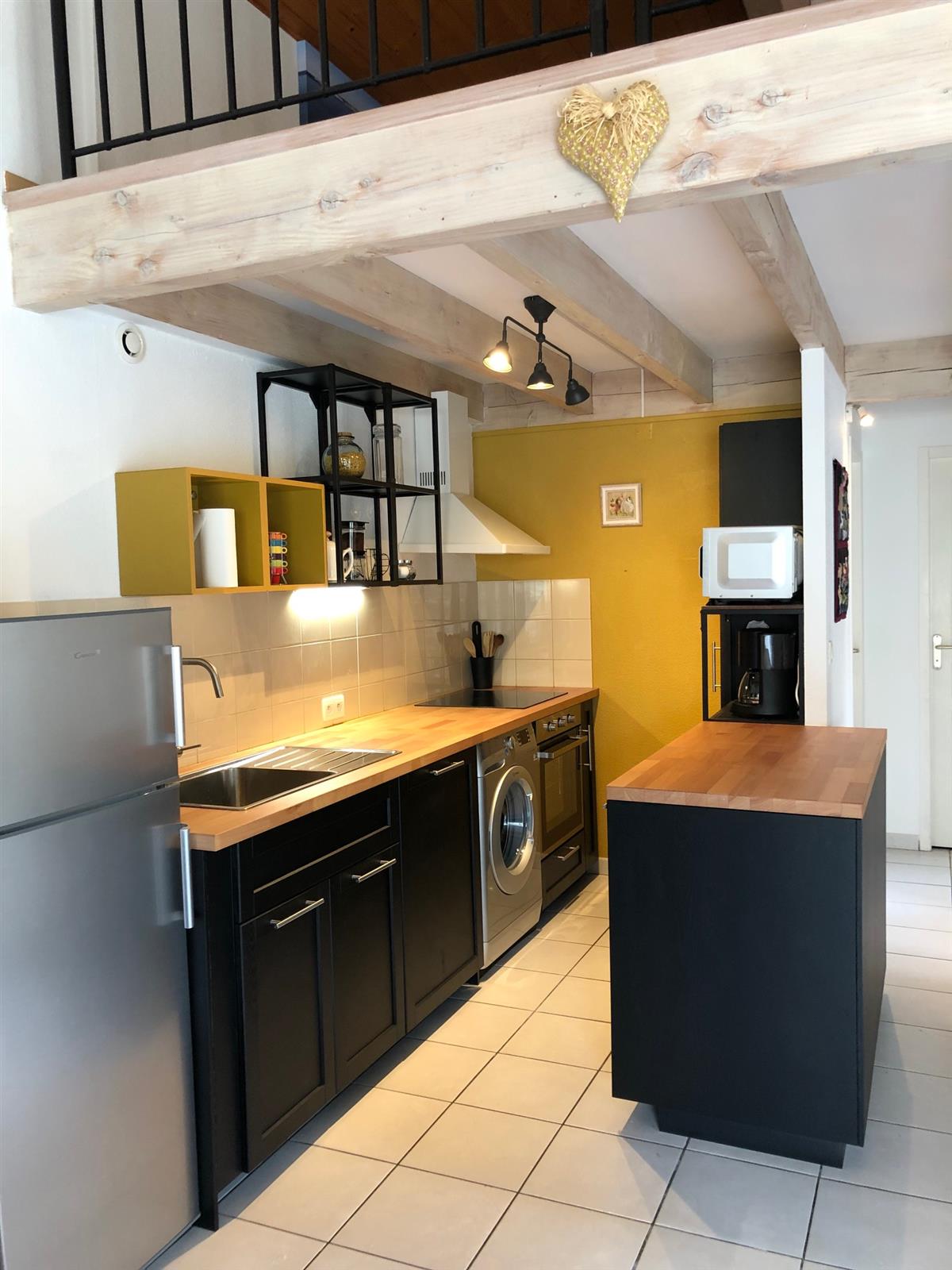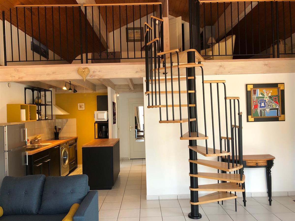 Elle comprend un salon lumineux ouvrant sur une terrasse en bois et un petit jardin de ville, une cuisine ouverte, deux chambres au rez-de-chaussée, une salle de bains avec baignoire, et des WC séparés. À l’étage, une mezzanine accueille une grande chambre pour deux personnes avec coin repos, salle d’eau et WC.